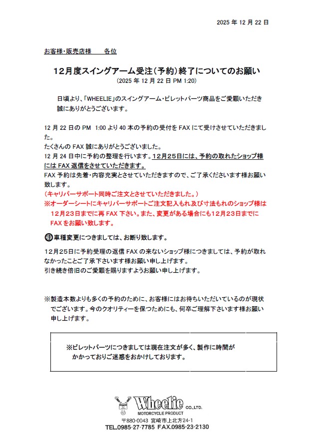 2025年12月度スイングアーム受注(予約)終了についてのお願い