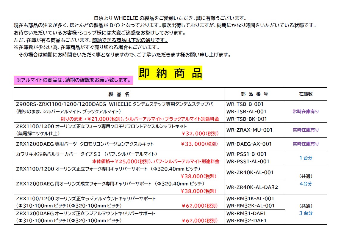 ZRX1100/1200/1200DAEG ステムバックオーダーの皆様へお知らせです