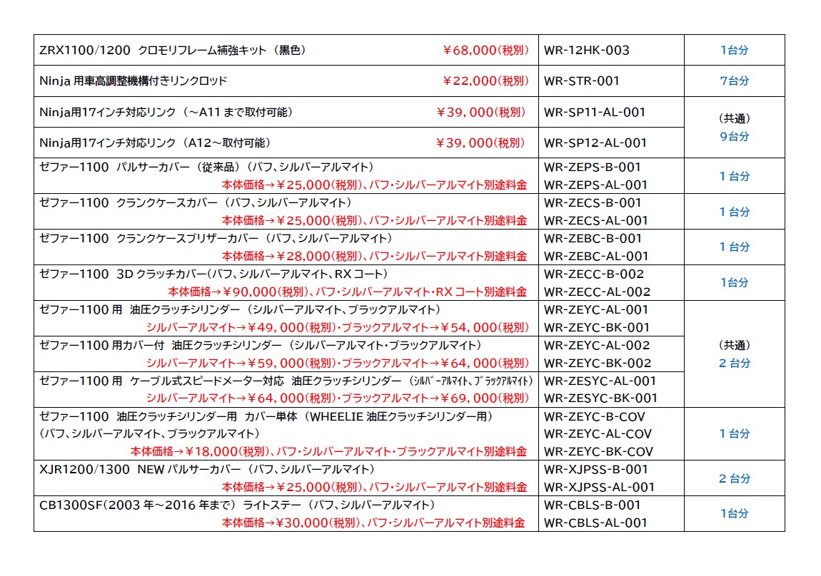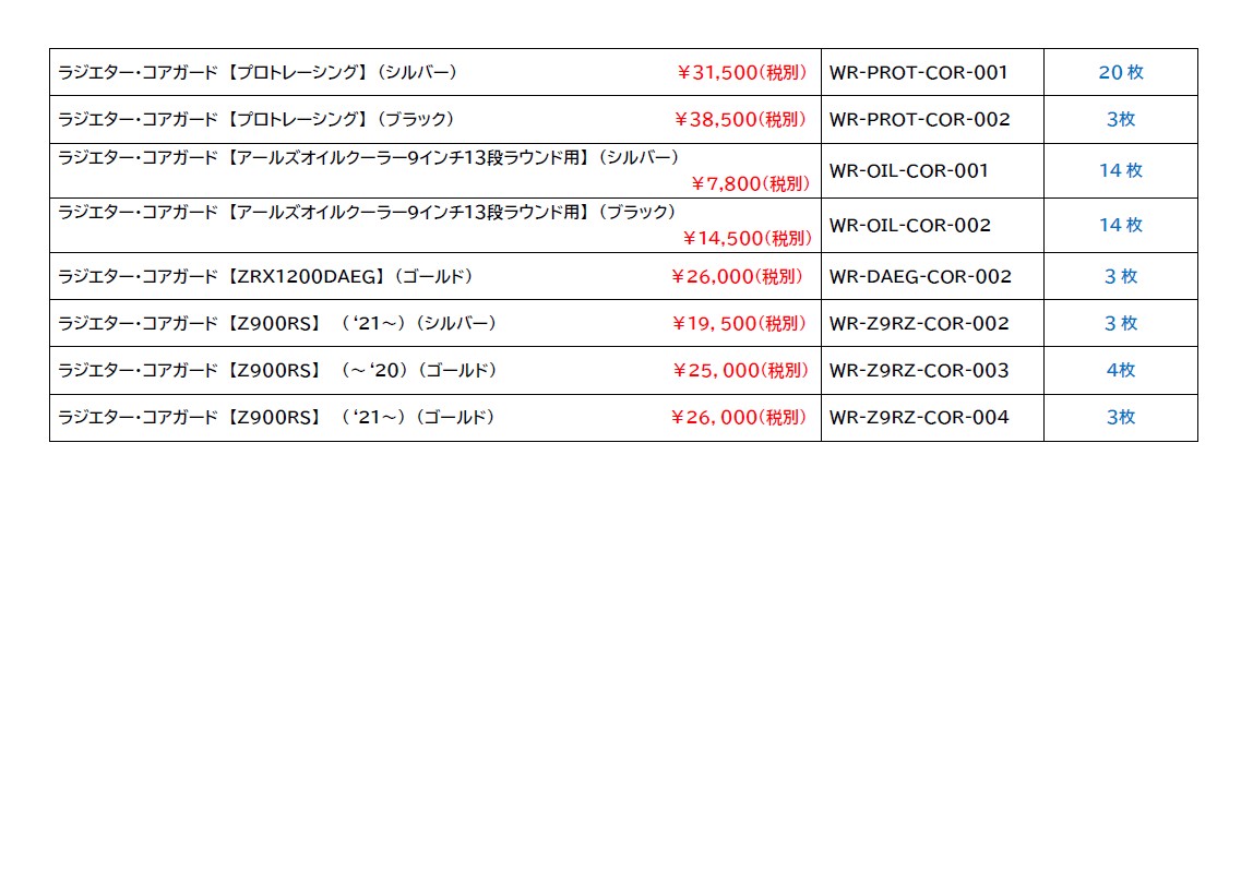製品価格表